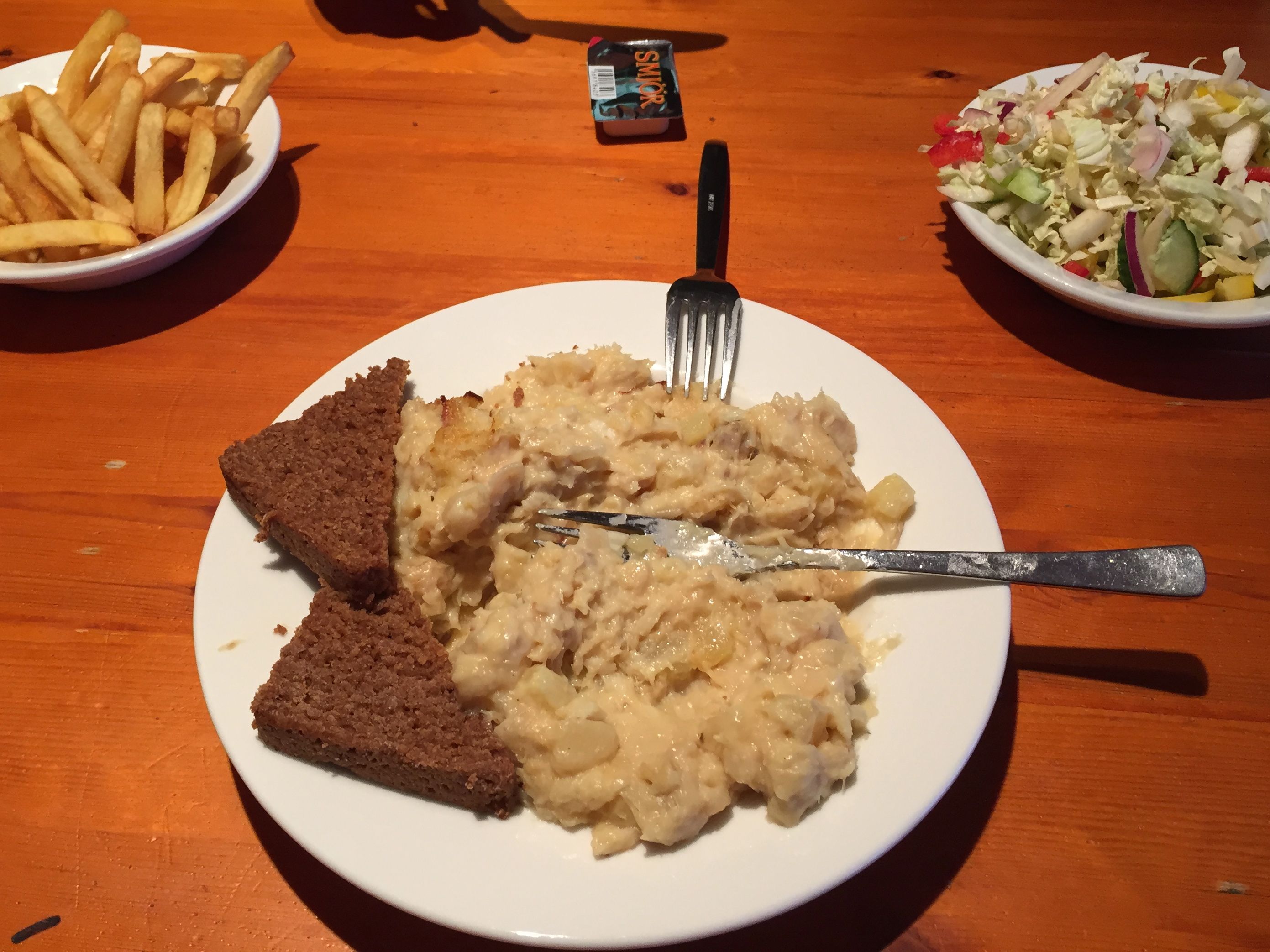 - After a half hour or so, we moved on to Vík, a nearby village, for a lunch break. I ordered fish stew, which in Iceland is a rich fish and potato casserole au gratin. A token side salad rounded out my meal.