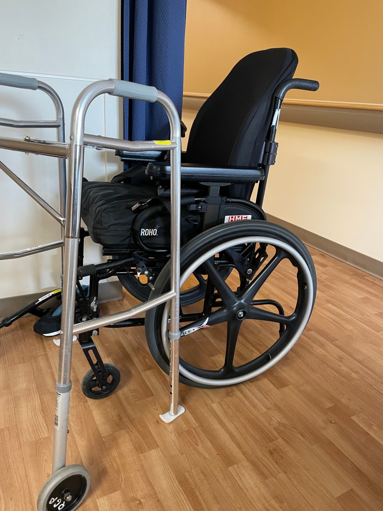 As I mentioned in my previous entry, last week was a doozy. Most notably, on Tuesday we had a team meeting in which I was told that I’ll be discharged needing to use a wheelchair both inside and outside. That was, as you can likely imagine, hard news to swallow. I’ll also require a special hospital bed like the one I sleep on/spend the majority of my time lounging on here, and my husband and I need to move since our current apartment isn’t wheelchair accessible.
