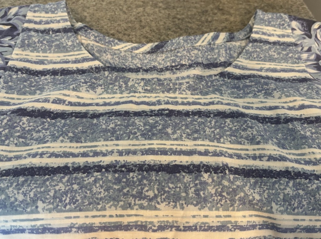 Despite a few bumps and machine issues (this was in my pre-Bernette era), everything went disconcertingly well, and I was all too pleased with the masterpiece that was taking shape between my fingers. By the time I reached the bias binding—the very last step—my ego was swollen with as much confidence I ever feel. Of course, “as much confidence I ever feel” isn’t all that much by most people’s standards. I thus asked a fellow sewing enthusiast with much more experience and know-how than I possess for tips and then sewed a few practice necklines. It took work, but I eventually finangled them into being tidy(ish), so I sewed a few more, took a deep breath, and sat down with Solstice Skipper in one hand and the bias binding in the other.