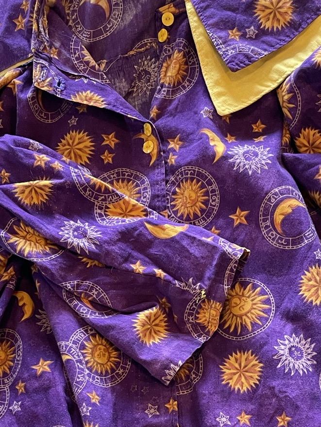 When I was ten or so, my mom sewed a solstice dress for me to wear to winter solstice rituals. (I won’t elaborate on the yearly event, but think “simulated birth canal.”) I still have that magnificent gown, which is in a purple 1990s celestial print that could be mistaken for nothing but a relic of the particular cultural moment in which it was made. It still fits, kinda.