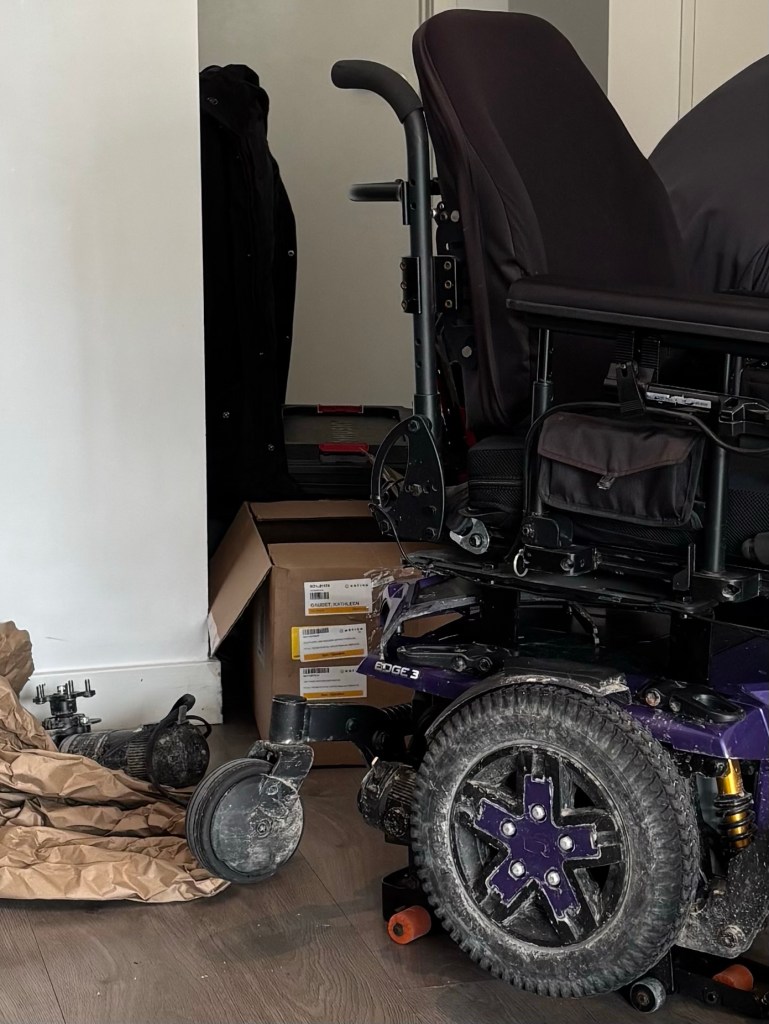 I asked him what I should do about it. Although it was reassuring to know that there wasn’t anything majorly wrong, the ever-worsening sound was at this point too loud and annoying to be ignored. My wheelchair is usually stealthily quiet, and now I was a bovine with a jangling cowbell preannouncing my presence everywhere I went. I turned heads in a bad way; even the audiobooks perpetually playing from my AirPods couldn’t drown out its cries for attention.